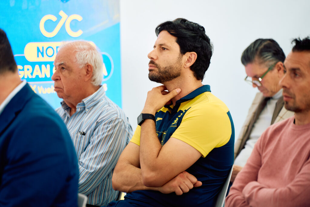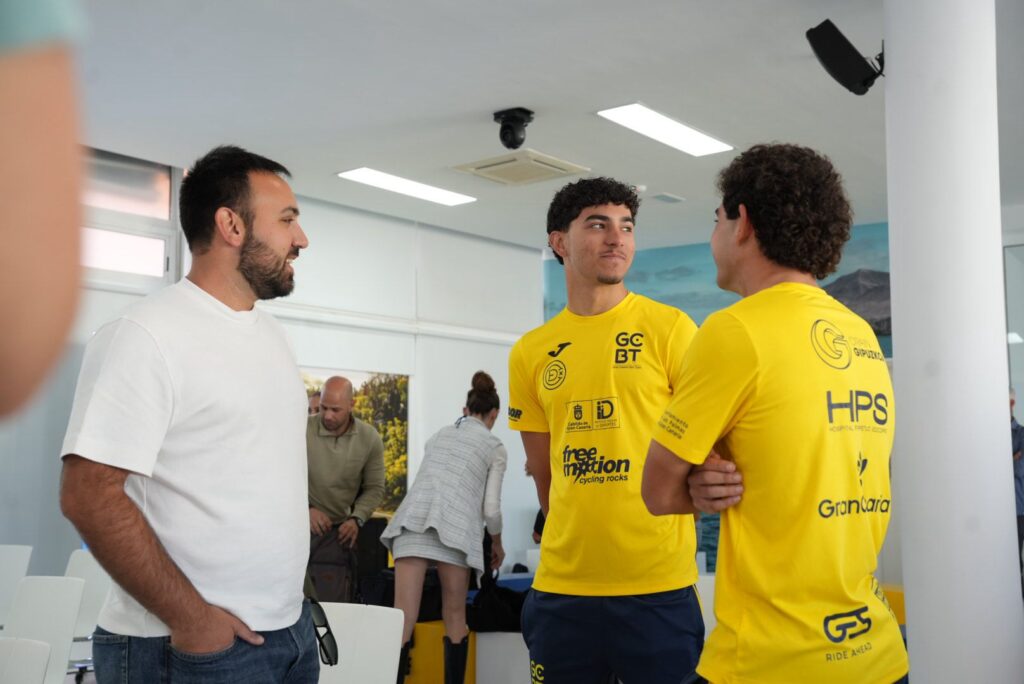 En representación de los corredores, intervino Alberto González, ciclista del Gran Canaria Bike Team, acompañado por su compañero Alberto Pérez, quienes pusieron en valor la relevancia de disputar en casa una prueba de este nivel. Ambos coincidieron en señalar que competir en la isla en una carrera de esta categoría supone una oportunidad única y una motivación añadida para los ciclistas canarios. El acto contó también con la presencia del Director Deportivo del equipo, Yojan Reyes.